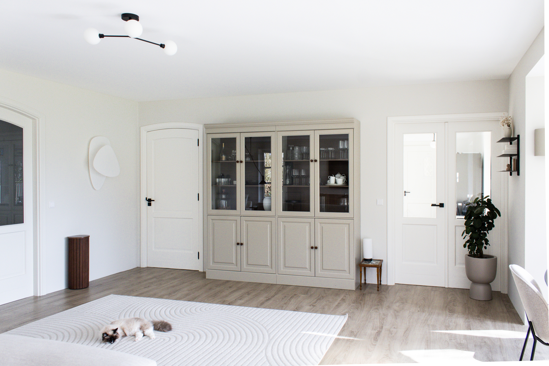 Een grote wens van mij was het creëren van meer kastruimte in onze woonkamer. Het liefst wilde ik een buffetkast met glazen deurtjes voor servies en glaswerk. Tegelijkertijd wilde ik speelgoed en spelletjes uit het zicht opbergen. En dus ging ik op zoek naar een kast met beiden: glazen deurtjes bovenin en aan de onderkant dichte deurtjes. Uiteindelijk kwam ik uit bij vitrinekast Chow van Vtwonen. Ik kocht twee stuks die ik strak tegen elkaar aan plaatste. Nu lijkt het één brede kast.