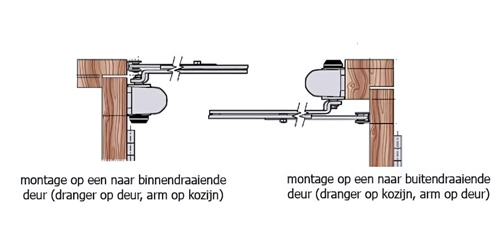 Het drangerhuis kunt u zowel op het kozijn als op de deur monteren. Dit kastje komt wel altijd aan de kant van de scharnieren. Op de afbeelding ziet u links een deurdranger met montage op een naar binnendraaiende deur(met dranger op de deur en arm op het kozijn) en op rechts een afbeelding van montage op een naar buitendraaiende deur (met de dranger op het kozijn en de arm op de deur)