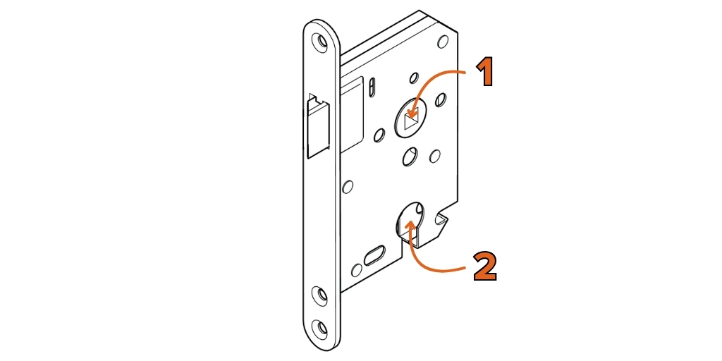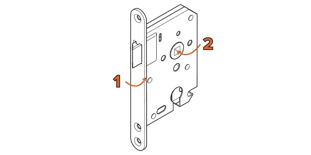 De doornmaat is een belangrijke aanwijzing of een bepaald insteekslot in uw deur past of niet. Met de doornmaat van een slot wordt de afstand tussen de voorplaat (1) (het gedeelte dat zichtbaar is aan de kopse kant van de deur) en de het hart van het cilinder- of krukgat (2) bedoeld. De standaard doornmaat is bij insteeksloten 50 mm. Hoewel dit verreweg de meest voorkomende maat is, is het niet aan te raden hierop te gokken. Er zijn namelijk ook sloten met afwijkende doornmaten. Zo is een doornmaat van 60 mm ook niet ongebruikelijk. Daarnaast hebben vooral oudere sloten nog wel eens een afwijkende doornmaat. Meet de doornmaat van uw oude slot daarom altijd even na voordat u een nieuw slot bestelt. Dit doet u door met een rolmaat de afstand tussen de voorplaat en het hart van het slot- of krukgat te meten. U kunt de doornmaat zowel meten als het slot al is verwijderd, als wanneer het slot nog in de deur zit. Sloten met een standaard maat passen vrijwel altijd in standaard deuren.