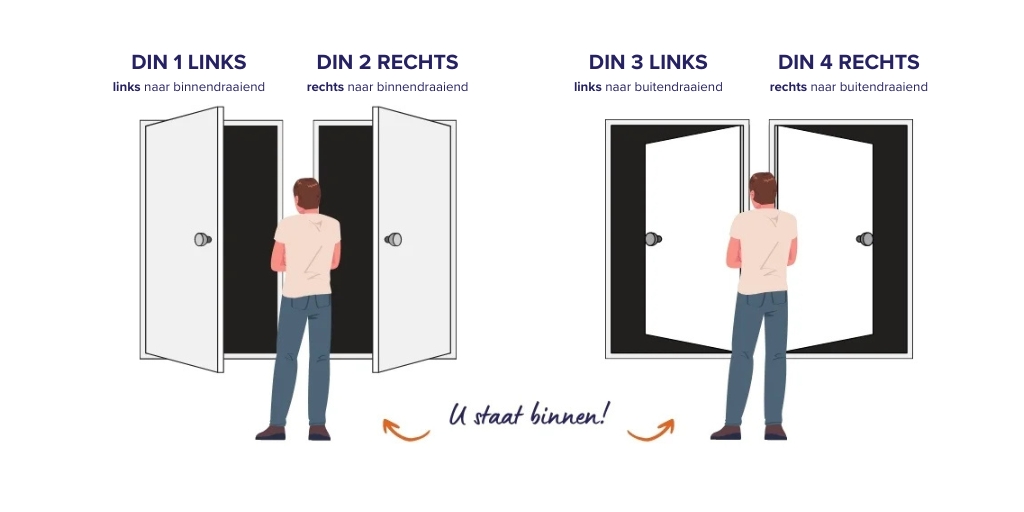 Er is een handige regel voor het bepalen van de draairichting van een deur. U dient daarvoor aan de kant van de deur te staan waar de deur naartoe opent. Hangen de scharnieren rechts, dan is de deur rechtsdraaiend. Hangen de scharnieren links, dan weet je dat de deur linksdraaiend is. De positie van de scharnieren bepalen dus de draairichting.
