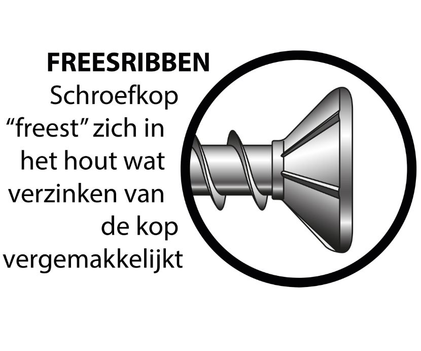 Platkop. Met boorpunt, helpt splijten voorkomen. Freesribben, de schroef verzinkt zichzelf. POZI-2 aansluiting, meer grip tijdens indraaien. Geheel verzinkt, dus een hoge corrosieweerstand.