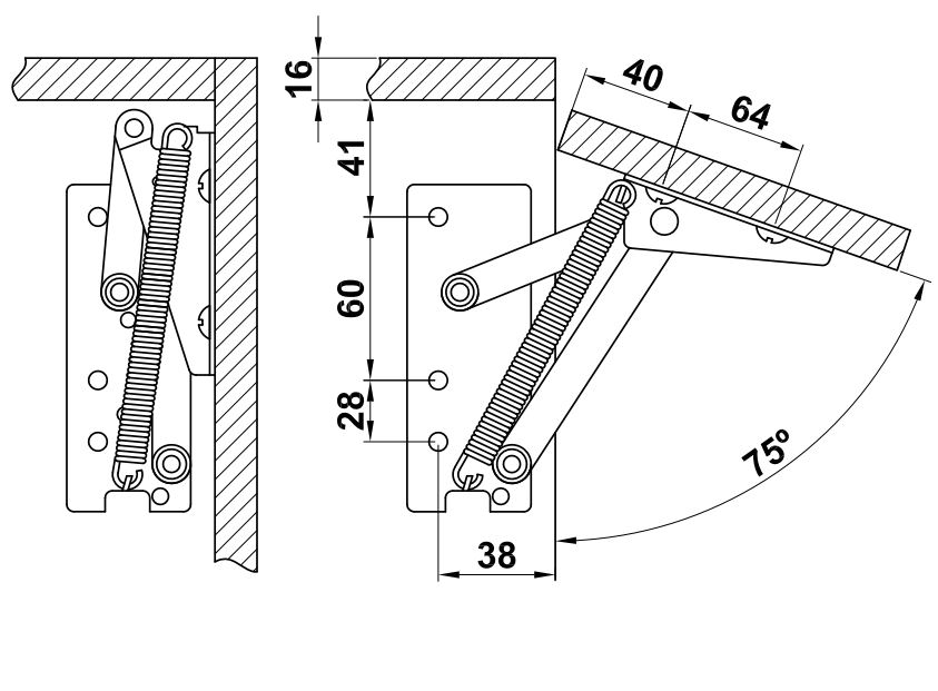 Versterkte veerscharnier met opwaartse openingsfunctie.