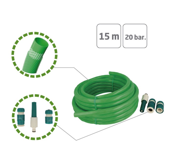 Flexibele tuinslag set van PVC. De slang is extra stevig omdat hij uit drie lagen bestaat, met een sterke vezel-laag erin. Zeer flexibel en drukbestendig. De waterdruk van de tuinslang is ongeveer 20 bar. Gebruik dit product alleen in omgevingen tussen -20 en 60 graden, anders kan het stuk gaan of niet goed functioneren. Inclusief handige sproei- en aansluitaccessoires.
