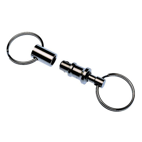 Deze autosnap sleutelhanger in vernikkelde uitvoering, kan d.m.v. één handeling van de sleutelring worden afgenomen en evenzo makkelijk weer worden bevestigd.