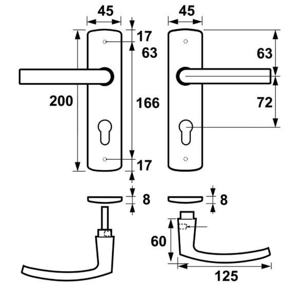 Ergonomisch vormgegeven deurklink en schilden.