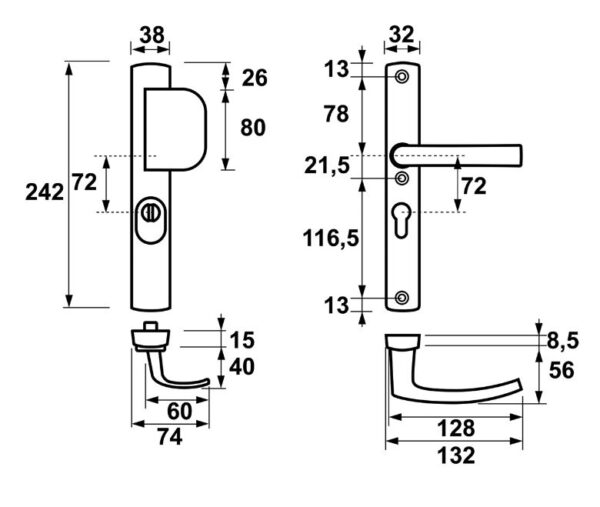 standaard toepasbaar op deuren van 38 tot 54 mm dik, voor dikkere deuren zijn verlengde krukstiften en bouten leverbaar