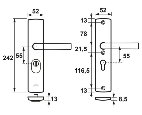 standaard toepasbaar op deuren van 38 tot 60 mm dik, voor dikkere deuren zijn verlengde krukstiften en bout leverbaar