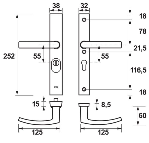 - standaard toepasbaar op deuren van 38 tot 54 mm dik, voor dikkere deuren zijn verlengde krukstiften en bout leverbaar