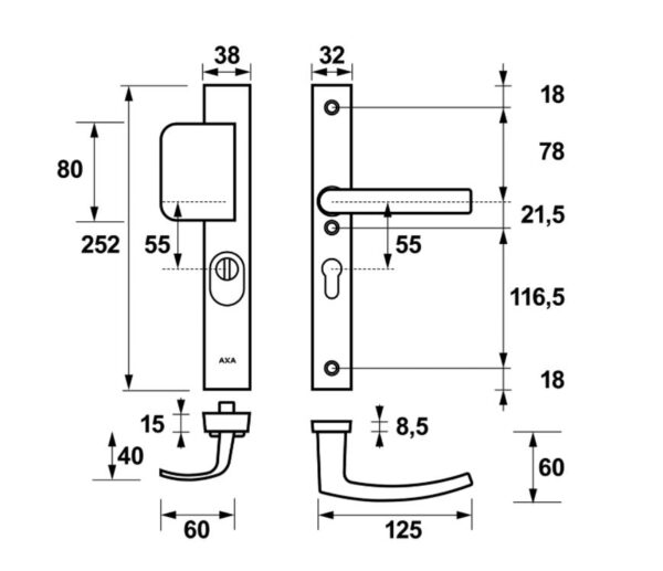 - standaard toepasbaar op deuren van 38 tot 54 mm dik, voor dikkere deuren zijn verlengde krukstiften en bout leverbaar