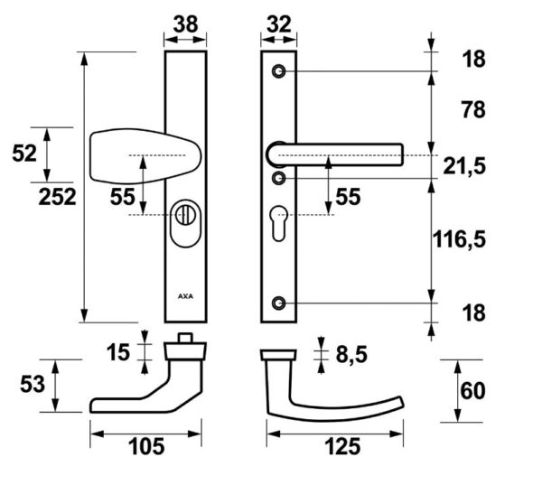 - standaard toepasbaar op deuren van 38 tot 54 mm dik, voor dikkere deuren zijn verlengde krukstiften en bout leverbaar