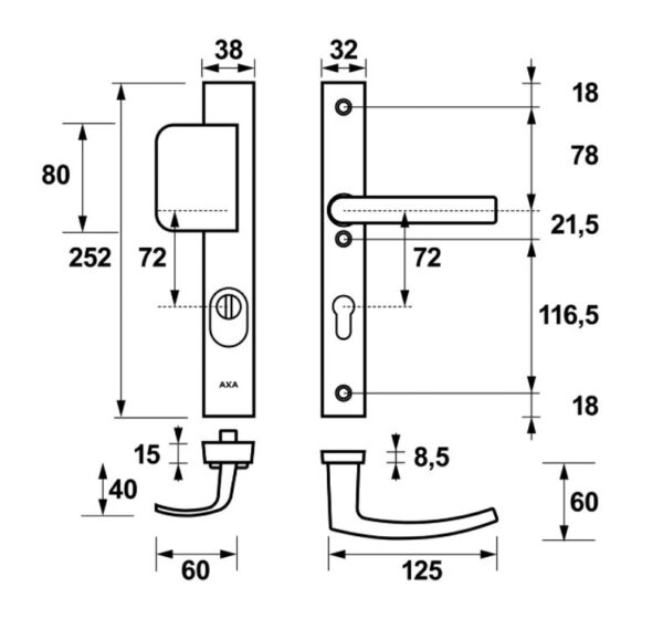 - standaard toepasbaar op deuren van 38 tot 54 mm dik, voor dikkere deuren zijn verlengde krukstiften en bout leverbaar
