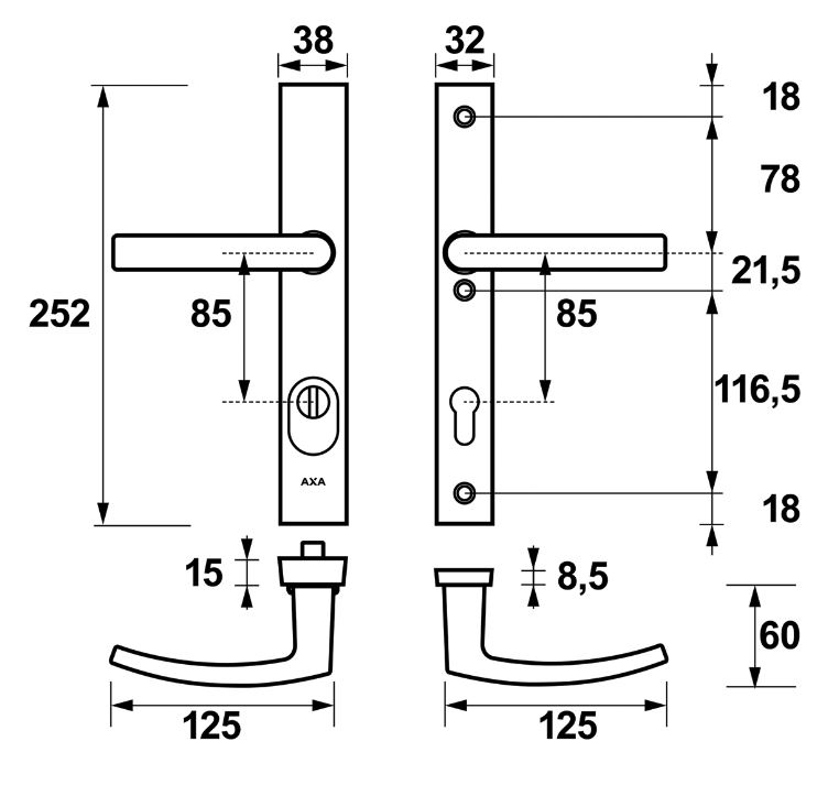 - standaard toepasbaar op deuren van 38 tot 54 mm dik, voor dikkere deuren zijn verlengde krukstiften en bout leverbaar