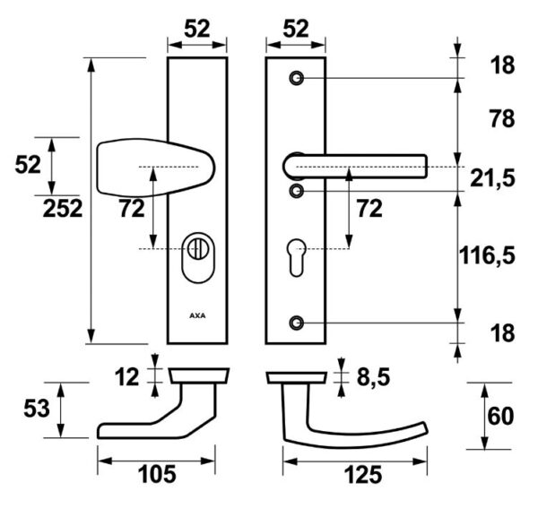 - standaard toepasbaar op deuren van 38 tot 54 mm dik, voor dikkere deuren zijn verlengde krukstiften en bout leverbaar