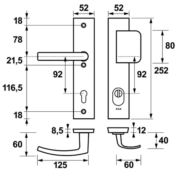 - standaard toepasbaar op deuren van 38 tot 54 mm dik, voor dikkere deuren zijn verlengde krukstiften en bout leverbaar