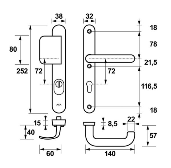 - standaard toepasbaar op deuren van 38 tot 54 mm dik, voor dikkere deuren zijn verlengde krukstiften en bout leverbaar
