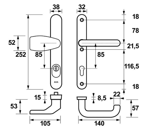 - standaard toepasbaar op deuren van 38 tot 54 mm dik, voor dikkere deuren zijn verlengde krukstiften en bouten leverbaar