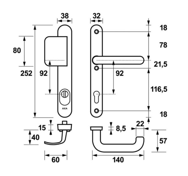 - standaard toepasbaar op deuren van 38 tot 54 mm dik, voor dikkere deuren zijn verlengde krukstiften en bout leverbaar