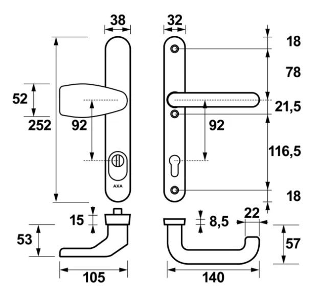 - standaard toepasbaar op deuren van 35-43 en 54-55 mm dik, voor dikkere deuren zijn verlengde krukstiften en bouten leverbaar