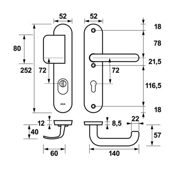 - standaard toepasbaar op deuren van 38 tot 54 mm dik, voor dikkere deuren zijn verlengde krukstiften en bout leverbaar