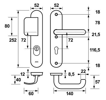 - standaard toepasbaar op deuren van 38 tot 54 mm dik, voor dikkere deuren zijn verlengde krukstiften en bouten leverbaar