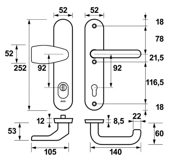 - standaard toepasbaar op deuren van 38 tot 54 mm dik, voor dikkere deuren zijn verlengde krukstiften en bouten leverbaar