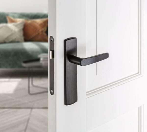 Complete set van AXA binnendeurbeslag. De set bestaat uit een loopslot met zwarte voorplaat, rechthoekige sluitplaat, patentboutjes t.b.v. deuren t/m 40 mm en een set aluminium deurklinken op schild zwart.
