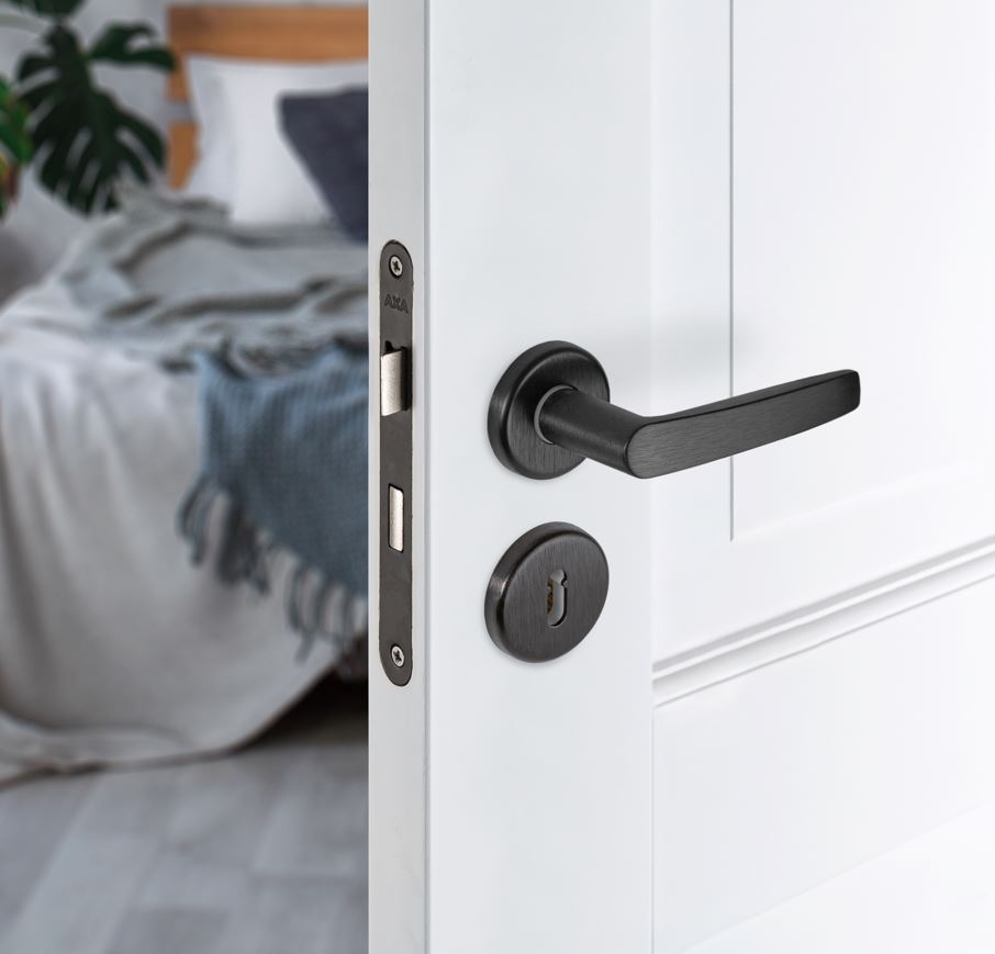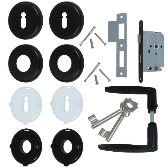 Complete set van AXA binnendeurbeslag. De set bestaat uit een dag-nachtslot klavier met zwarte voorplaat, rechthoekige sluitplaat, patentboutjes t.b.v. deuren t/m 40 mm en een set rozetten, sleutelplaatjes en deurklinken.