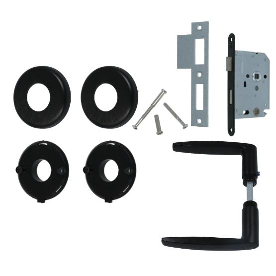 Complete set van AXA binnendeurbeslag. De set bestaat uit een loopslot met zwarte voorplaat, rechthoekige sluitplaat, patentboutjes t.b.v. deuren t/m 40 mm en een set rozetten en deurklinken.