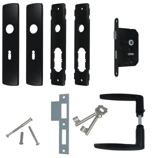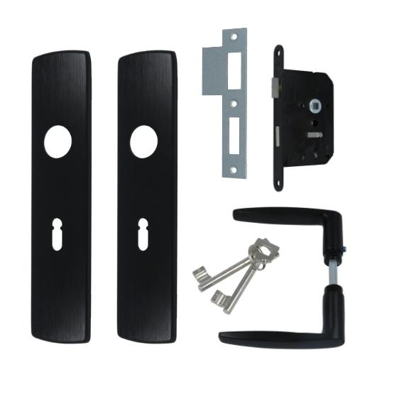 Complete set van AXA binnendeurbeslag. De set bestaat uit een dag-nachtslot klavier met zwarte voorplaat, rechthoekige sluitplaat, patentboutjes t.b.v. deuren t/m 40 mm en een set aluminium deurklinken op schild zwart.