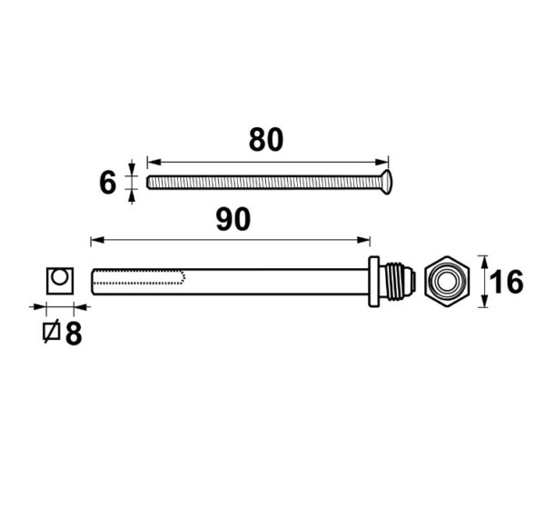 AXA wisselstift + set bouten 8×90+M6x80 (3x) zwart