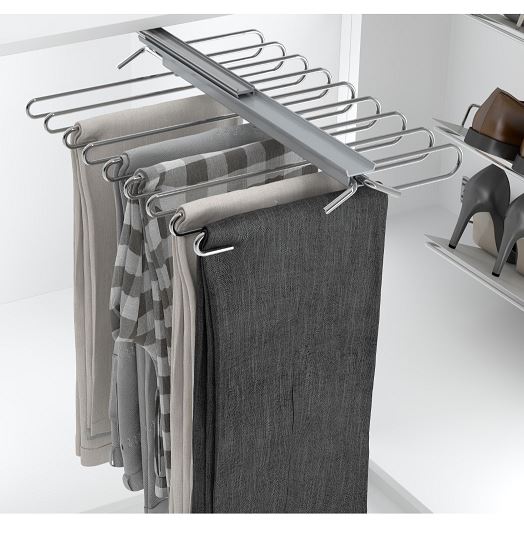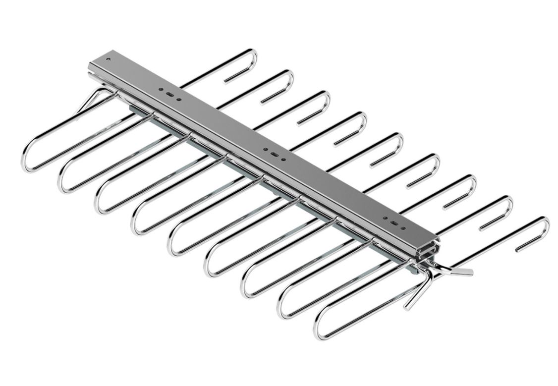 Deze volledig uittrekbare, chromen broekenhouder heeft ruimte voor het netjes ophangen van 9 broeken. De beugels zijn gebogen om het afschuiven van de broeken te voorkomen, de geleiders zijn kogelgelagerd voor een soepele loop.