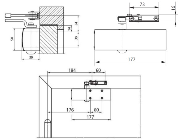 Het slanke deurdrangerhuis is uit massief aluminium vervaardigd met zeer beperkte afmetingen: L 177 mm x D 39 mm x H 50 mm.
