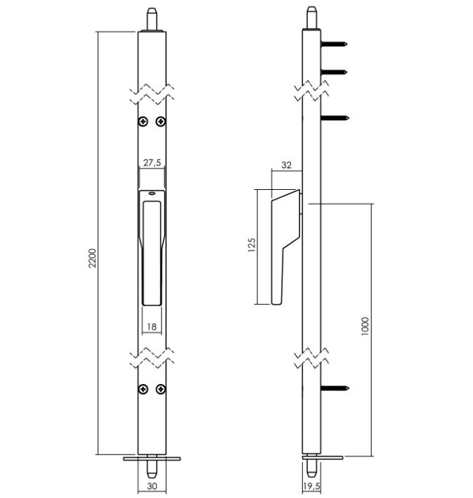 Deurespagnolet niet afsluitbaar 220cm rechtsdraaiend aluminium F1