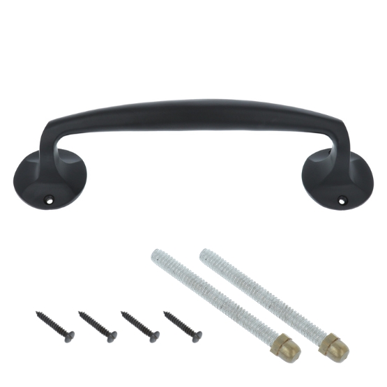 Deze deurgreep wordt bevestigd met de meegeleverde zwarte schroeven en/of de meegeleverde bouten. De hart op hart afstand van deze bouten is 203 mm.