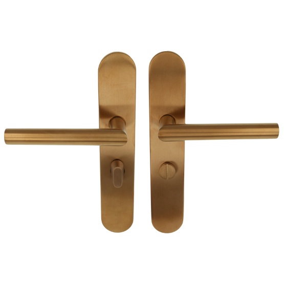 Deze deurklink is vast-draaibaar met metalen onderconstructie geveerd op schild. Het schild is voorzien van een wc-sluiting. Het materiaal is rvs met een PVD licht bronzen coat.
