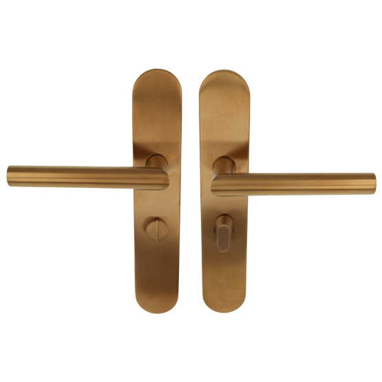 Deze deurklink is vast-draaibaar met metalen onderconstructie geveerd op schild. Het schild is voorzien van een wc-sluiting. Het materiaal is rvs met een PVD licht bronzen coat.