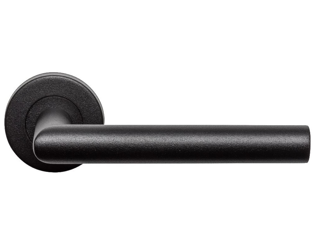 Industriële deurklink, zwart RAL9005 gepoedercoat, geveerd, met ring en stalen onderrozet voor intensief gebruik.