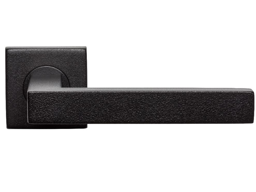 Industriële deurklink, zwart RAL9005 gepoedercoat, geveerd, met ring en stalen onderrozet voor intensief gebruik.