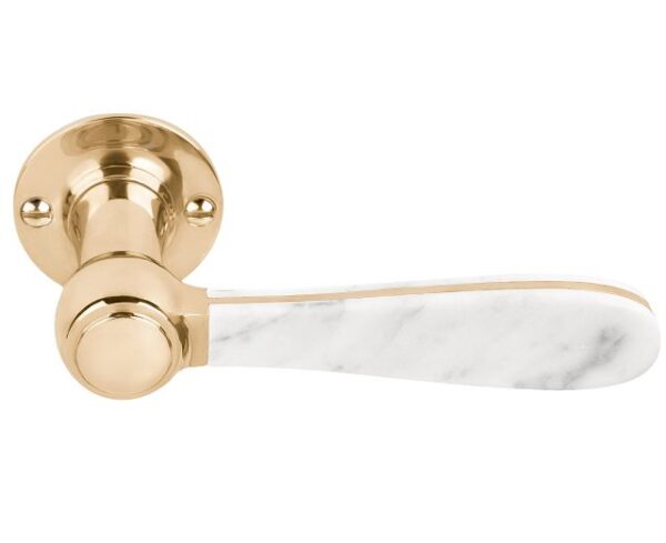 Dit is een massieve deurklink vast-draaibaar geveerd op rozet. Deze deurklink is van Formani uit de serie BOSCO. De designer is LÁZARO ROSA-VIOLÁN. Het materiaal is messing ongelakt/Carrara marmer.