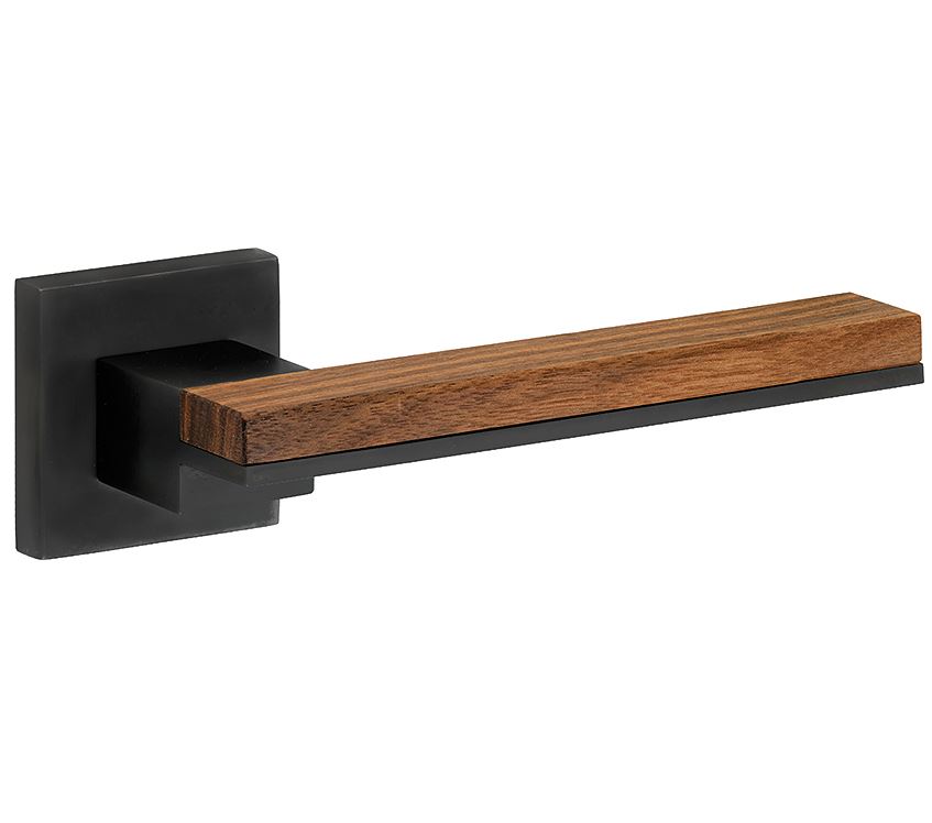 Deurklink op geveerd rozet Mimolimit PVD mat zwart/walnoot