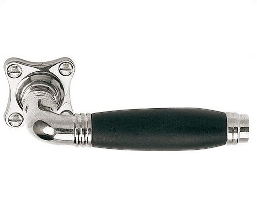 Het materiaal van deze deurklink is glans nikkel en ebbenhout. Deze deurklink is massief, geveerd op klaver rozet.