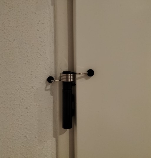 De Deurspin/deursluiter gaat over de paumelle heen. (Zie afbeelding 2)