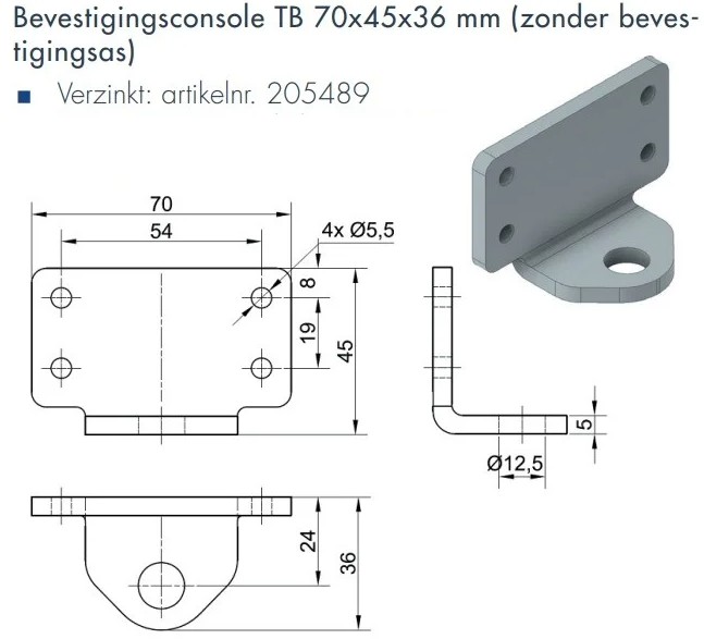 – Bevestigingsconsole TB 70x45x36 mm (zonder bevestigingsas) : Verzinkt: artikelnr. 205489