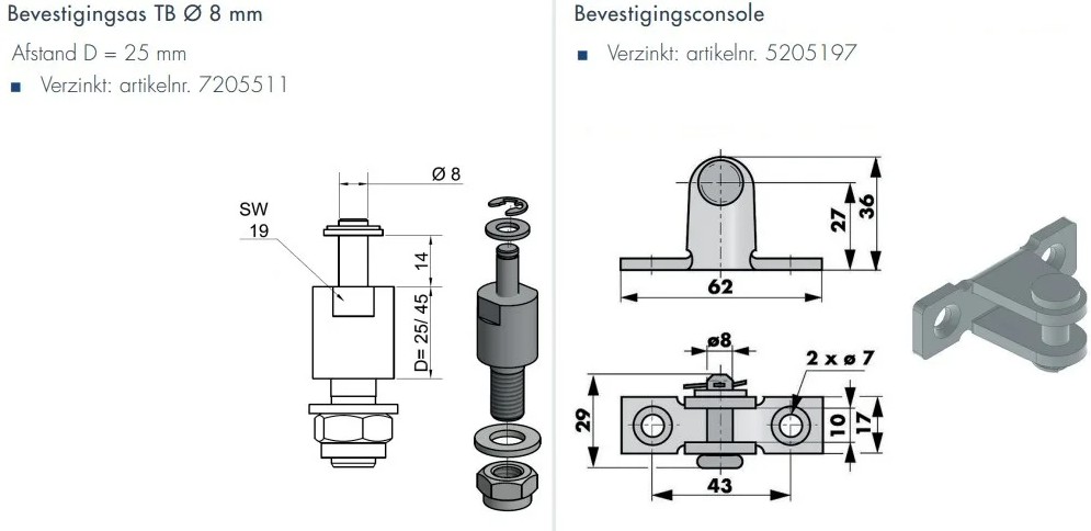 – Bevestigingsas TB Ø 8 mm : Verzinkt: artikelnr. 7205511
