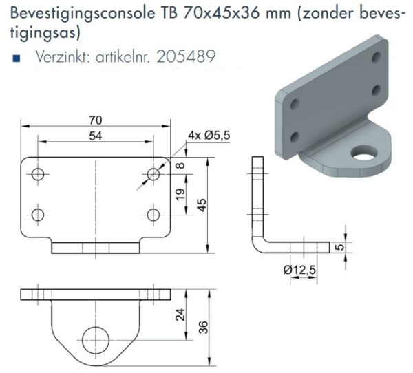 – Bevestigingsconsole TB 70x45x36 mm (zonder bevestigingsas) : Verzinkt: artikelnr. 205489