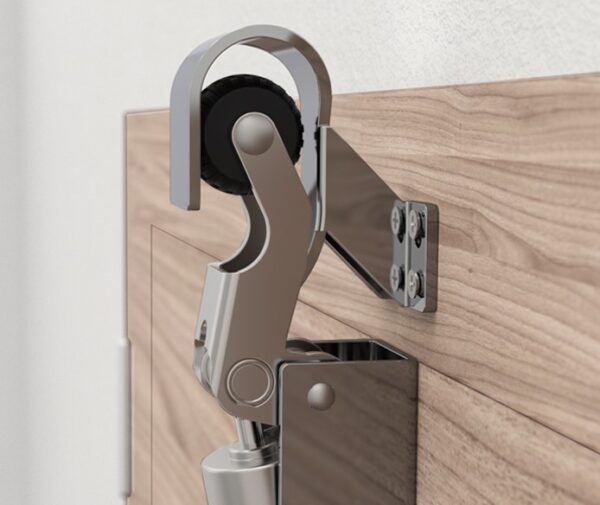 De haak wordt op het kozijn bevestigd op zo’n manier dat de rubberroller gecentreerd binnenkomt. De haak zit op de juiste hoogte als de rubberroller op de gebogen hendel net de voorkant van de haak raakt bij het sluiten.