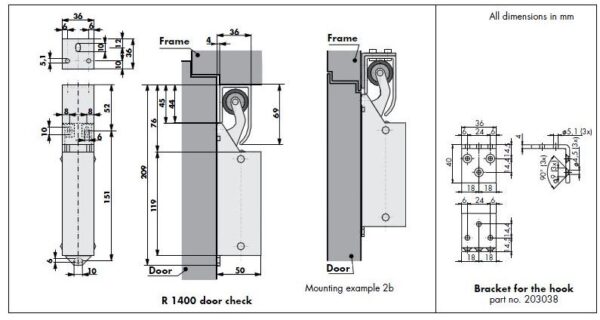 Belangrijk: Door de haak die in de deuropening uitsteekt, vooral in afbeelding 1 en 2a, en om elk risico op letsel te vermijden, moet de deuropvanger 1400 altijd aan de zijkant worden gemonteerd, en niet in het midden van de deur.