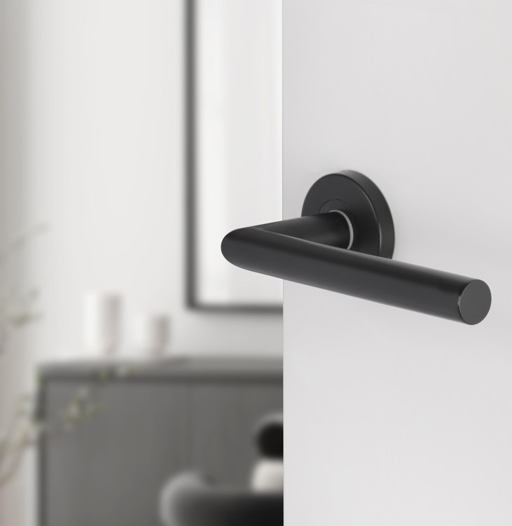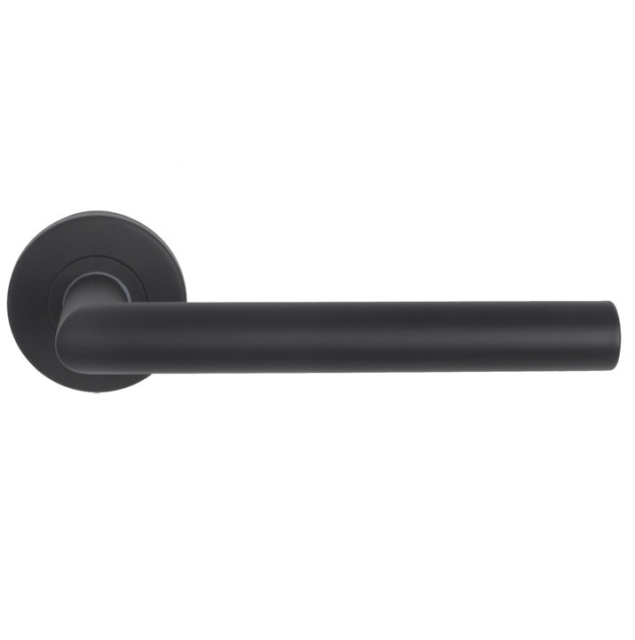 Differnz rechte deurklink op rond rozet. In de kleur mat zwart. Gemaakt van roestvrij staal, dus duurzaam, roestbestendig en eenvoudig in onderhoud. Bovendien gemakkelijk te monteren!