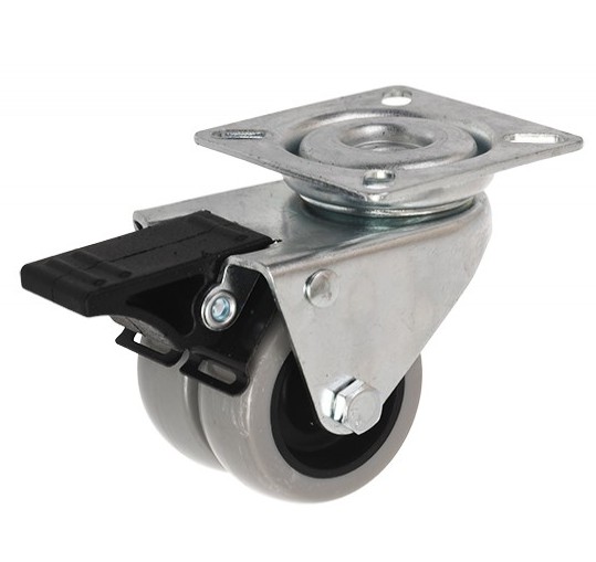 Dubbele grijze zwenkwiel met rem en metalen bevestigingsplaat.