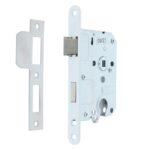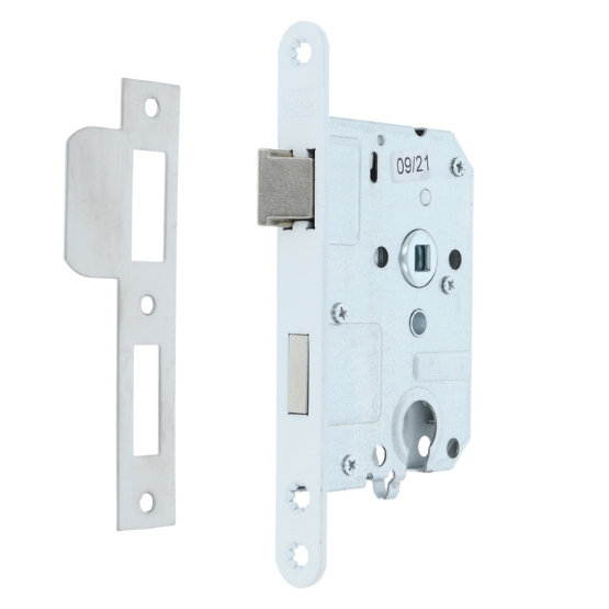 Dit cilinder insteekslot heeft een doornmaat van 50 mm. Dit is de afstand van het hart van het profielcilindergat tot de voorkant van de voorplaat van het slot. De maat van het hart van het sleutelgat tot het hart van het krukgat is 55 mm. Het cilinderinsteekslot wordt geleverd inclusief rechthoekige sluitplaat. De afgeronde voorplaat is wit gelakt. De maten van deze plaat zijn 174 x 20 mm.